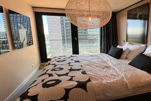 Indeling: Entree met hal die toegang biedt tot de was-/bijkeuken met wasmachine en droger en een separaat toilet met fonteintje. Lichte en lichte woonkeuken met ruim terras gelegen op het zuidwesten met bijzonder uitzicht over het centrum van Amsterdam. Moderne Bulthaup keuken voorzien van alle inbouwapparatuur. Hoofdslaapkamer met tweepersoonsbed en een eigen badkamer en-suite met inloopdouche, dubbele wastafel, ligbad en een 2e toilet. Tweede slaap- of studeerkamer met extra badkamer. Bij voorkeur te huur voor expats, met voorafgaande toestemming van de eigenaar.