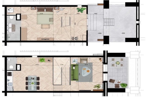 Indeling: Centrale entree. Vervolgens ontvangst hal met toegang tot de parkeergarage en fietsenstalling. Hier zit ook de trap en lift naar de etages. Centrale hal met een kleine trap naar de voordeur van het appartement. Ruime kamer met veel ruimte om een slaapkamer in te richten. Dit is geen afgesloten slaapkamer. Toegang tot de badkamer welke is voorzien van een dubbele wastafel, zwevend toilet, inloop douche en design radiator. Naast de badkamer is nog een wasruimte aanwezig waar je een wasmachine en droger kunt plaatsen. In de ruimte is een open trap naar de eerste etage. Deze is verdeeld in een woon- en eetkamer op verschillende hoogtes. Het plafond is zeer hoog. Het woonkamer deel heeft enorme ramen waardoor er veel licht binnen valt. Vanaf hier heb je toegang tot het ruime terras. Via 3 trede stap je de eetkamer en keuken in. De keuken is modern en voorzien van verschillende inbouw apparatuur. Denk aan inductie kookplaat, afzuigkap, vaatwasser en koelkast.