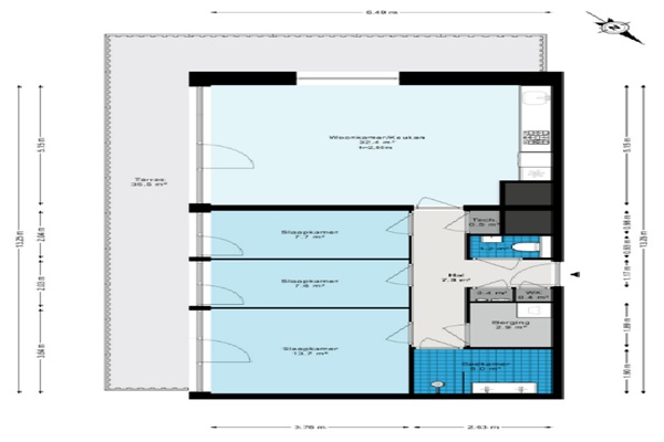 Het appartement heeft een oppervlakte van circa 83m2. Vanuit de hal zijn alle vertrekken van de woning te bereiken. De woonkamer met open keuken heft een oppervlakte van circa 33 m2 en is voorzien van alle benodigde inbouwapparatuur zoals een kookplaat, combi oven/magnetron, afzuigkap, koelkast, vriezer en een vaatwasser. Vanuit de woonkamer is toegang naar het ruime terras rondom het appartement van circa 35m2. De grootste slaapkamer heeft een oppervlakte van circa 14 m2 en twee van circa 8m2. De badkamer is uitgerust met een inloopdouche, wastafel met dubbele kranen en handdoekradiator. Daarnaast beschikt het appartement over een inpandige berging met wasmachine aansluiting en een separaat toilet. Het appartement wordt opgeleverd met PVC vloer en witte wandafwerking. –Niet mogelijk voor studenten om te huren –Woningdelers niet toegestaan