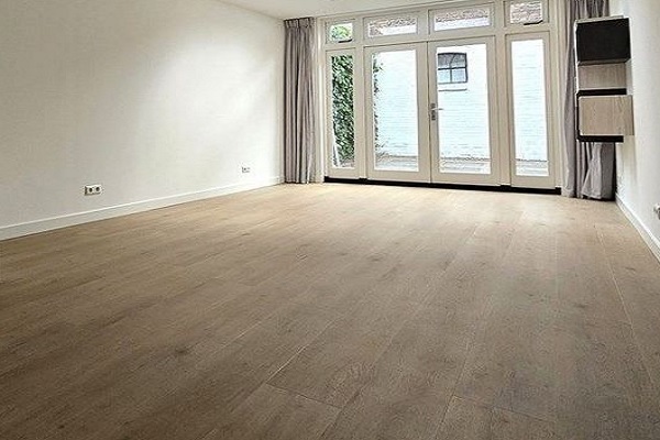 Indeling: Begane grond: gang, modern toilet. Woonkamer (ca. 5.85 x 3.55 m.) met houten vloer en openslaande deuren naar de achtertuin (ca. 4.20 x 4.m.). Open keuken (ca. 2.70 x 4.35 m.) met koel/vriescombinatie, vaatwasser, gaskookplaat en design radiator. Open trap naar: 1e verdieping: ruime overloop, 2 slaapkamers (ca. 3.55 x 3.00 m. en 1.95 x 3.00/3.60m.) beide met houten vloer. Kast met aansluiting voor wasmachine en-droger. Badkamer met inloopdouche, wastafel en toilet. Geen studenten of delers.