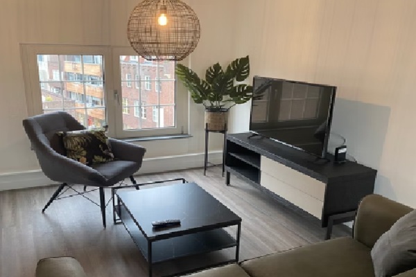 Ingericht met zithoek, flatscreen-tv, eettafel, bureau met bureaustoel. Voorzien van tweepersoonsbed (boxspring/pocketspring), kledingkast en nachtkastjes. Luxe wandkeuken met inbouwapparatuur: vaatwasser, combi-oven/magnetron, koelkast, kookplaat, koffiezetapparaat en waterkoker. Volledig betegeld, met inloopdouche, wastafelmeubel en toilet.