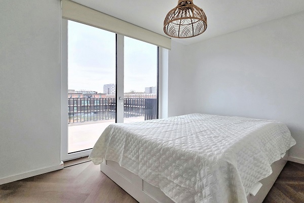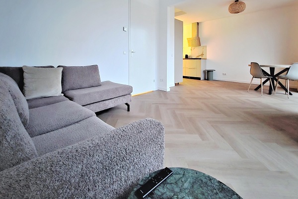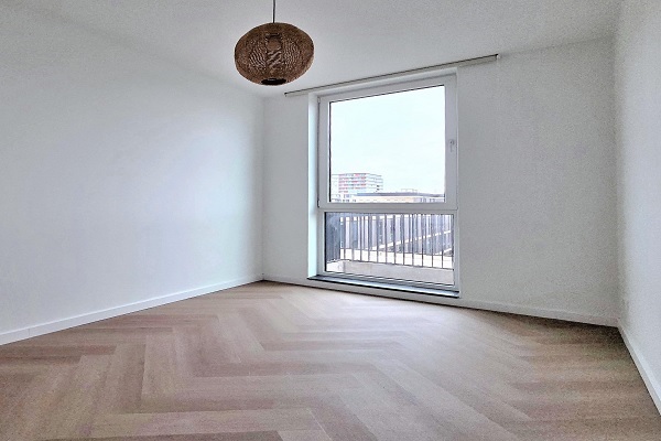 Indeling Via de centrale entree met video-intercom bereikt u de derde en bovenste verdieping met lift of trap. Uw eigen voordeur opent naar een ruime hal, die toegang biedt tot alle vertrekken. Het appartement beschikt over twee royale slaapkamers tegenover elkaar, waarvan één met tweepersoonsbed en ruime kasten. In de gang bevindt zich een apart toilet. De badkamer is voorzien van een inloopdouche en een stijlvol wastafelmeubel. De lichte woonkamer aan de voorzijde strekt zich over de volledige breedte van het appartement en sluit aan op een ruime, smaakvolle open keuken. Deze is uitgerust met moderne inbouwapparatuur, waaronder een inductiekookplaat met afzuiging, koel-vriescombinatie, vaatwasser en oven, en biedt voldoende kastruimte. In een aparte kast zijn de wasmachine en WTW-unit geplaatst. Het gehele appartement is voorzien van een fraaie PVC-vloer met vloerverwarming.