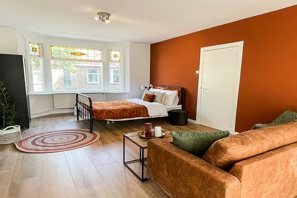 Indeling Wij bieden deze moderne, gemeubileerde studio aan in de Annie Foorestraat. De studio bevindt zich op de eerste verdieping van een karakteristiek gebouw. Bij binnenkomst in de warme studio vindt u direct rechts het slaapgedeelte met een tweepersoonsbed. Links bevindt zich de woon-/werkruimte, de douche en de keuken. De keuken is voorzien van een koelkast, kookplaat en spoelbak met moderne zwarte kraan. De studio beschikt tevens over een eigen toilet en douche, die beide recent zijn gerenoveerd.