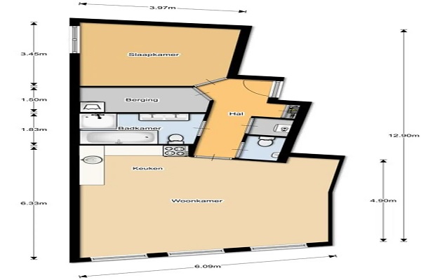Indeling Gemeenschappelijke afsluitbare entree, trap naar de 1e etage en de inpandige (fietsen)berging. Entree, hal met berging en modern toilet met fonteintje. Licht betegelde badkamer met douchecel, ligbad, 2e toilet en 2 wastafels. Ruime berging c.q. walk-in closet. Grote, lichte woonkamer met drie grote ramen met uitzicht op de winkelstraat. Open en in hoek opgestelde keuken met vaatwasser, spoelbak, 4-pits gaskookplaat, afzuigkap, koelkast met vriesvak en een combi-magnetron. Ruime slaapkamer aan de achterzijde.