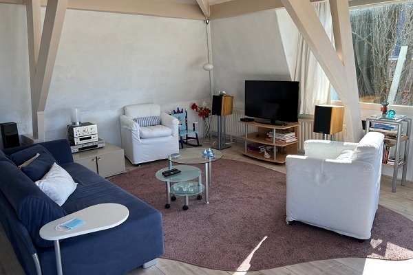 Authentieke bovenetage, met 1 hele grote ruimte, waarin de verschillende woonfuncties: koken, eten, douchen, slapen, zonnebaden en ontspannen op een knusse manier zijn gescheiden. in 2021 gerenoveerd: nieuwe open keuken, laminaatvloeren, kasten, verlichting, gordijnen, CV-installatie, enz. Zithoek met TV, muziekinstallatie, bank en fauteuils. Open keuken met bar en krukken, inductiekookplaat, koelkast, wasmachine, combi-oven. Inloopdouche, wastafel, föhn, strijkplank en strijkbout. Balkon met zitje, zonnestoelen en buitenverlichting.