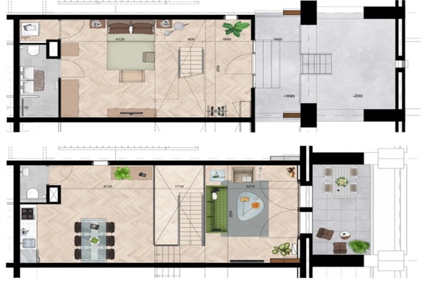 Indeling: Centrale entree. Vervolgens ontvangst hal met toegang tot de parkeergarage en fietsenstalling. Hier zit ook de trap en lift naar de etages. Centrale hal met een kleine trap naar de voordeur van het appartement. Ruime kamer met veel ruimte om een slaapkamer in te richten. Dit is geen afgesloten slaapkamer. Toegang tot de badkamer welke is voorzien van een dubbele wastafel, zwevend toilet, inloop douche en design radiator. Naast de badkamer is nog een wasruimte aanwezig waar je een wasmachine en droger kunt plaatsen. In de ruimte is een open trap naar de eerste etage. Deze is verdeeld in een woon- en eetkamer op verschillende hoogtes. Het plafond is zeer hoog. Het woonkamer deel heeft enorme ramen waardoor er veel licht binnen valt. Vanaf hier heb je toegang tot het ruime terras. Via 3 trede stap je de eetkamer en keuken in. De keuken is modern en voorzien van verschillende inbouw apparatuur. Denk aan inductie kookplaat, afzuigkap, vaatwasser en koelkast.