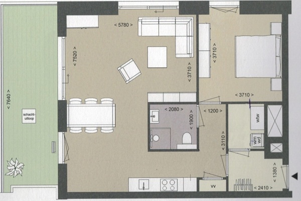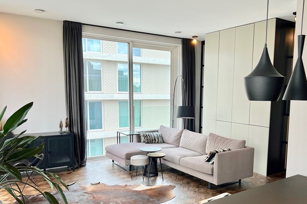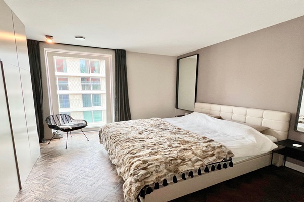 Indeling appartement: Entree/Ruime hal met videofoon. Ruime berging met wasmachine/droger combinatie. Zeer ruime en lichte woonkamer met ramen rondom en twee schuifpuien naar het balkon. Open keuken. Het keukenblok beschikt over een inductiekookplaat met 4 kookzones, vaatwasser, Quooker kraan, combi oven/magnetron, koelkast, vrieslades en voldoende kastruimte. De 'Master Bedroom' is 14m2 en beschikt over een grote inloopkast. Er staat een bed van 1.60 x 2.00. De badkamer is voorzien van een inloopdouche, badkamermeubel met wastafel, toilet en een handdoekradiator. Het appartement heeft een hoog plafond van 2,90. Er is vloerverwarming, die in de warmere zomermaanden kan worden gebruikt voor verkoeling. Het appartement is voorzien van ultrasnelle databekabeling. Het balkon is 20 m2 en georiënteerd op het Zuiden. Op het balkon staan 2 grote stoelen. Gemeenschappelijke representatieve entree met brievenbussen voor alle bewoners.