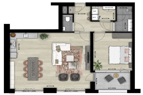 Het appartement beschikt over een ruime woonkamer met open keuken, één royale slaapkamer, een luxe badkamer met sanitair van Villeroy & Boch, separaat toilet, extra berging en een fijne loggia/balkon met prachtig uitzicht. De woning is volledig afgewerkt met een luxe PVC-vloer in houtlook en geschilderde wanden, waardoor je alleen je meubels nog hoeft te verhuizen. De keuken is compleet uitgerust met een 4-pits kooktoestel, ruime koelkast, combimagnetron en moderne vaatwasser. Zo wordt koken niet alleen eenvoudig, maar ook leuk. De badkamer is strak afgewerkt met een inloopdouche met vlakke vloer en moderne drain, en de wastafel met onderkast biedt handige opbergruimte.
