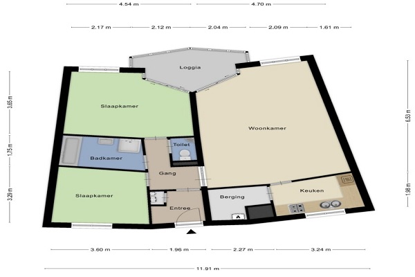 Centrale entree met bellentableau en brievenbussen. Via de hal heeft u toegang tot de lift en het trappenhuis maar ook tot de bergingen. Indeling: Entree appartement, hal, toilet, berging met aansluiting voor wasmachine en droger, lichte woonkamer. Vanuit de woonkamer heeft u toegang tot een ruim balkon. Het appartement beschikt over 2 slaapkamers.