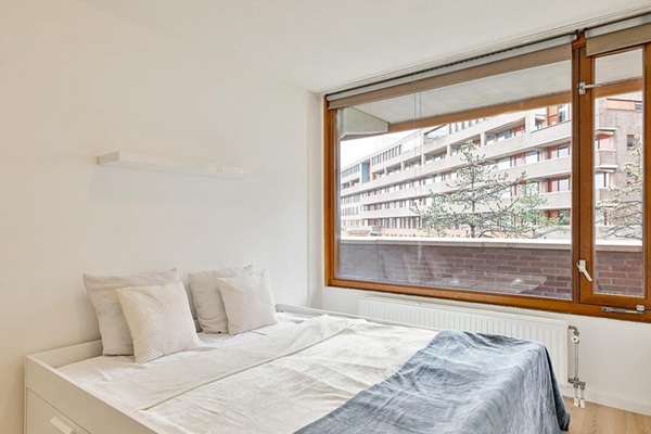 Indeling: U kunt de lift nemen naar de tweede verdieping. Open de voordeur naar de zeer ruime hal, waaraan alle kamers van dit appartement aansluiten. De ruime woonkamer heeft veel natuurlijk lichtinval door de grote raampartijen. Vanuit de woonkamer is tevens het balkon met middag- en avondzon te bereiken. De ruime hoogglans witte keuken heeft een zeer ruime keukenopstelling met alle benodigde inbouwapparatuur en een bar om uw gasten te vermaken tijdens het koken. Er is een aparte halfopen eetkamer met panoramisch uitzicht over de aangrenzende laagbouwbuurt. Het appartement beschikt over twee ruime slaapkamers, beide slaapkamers grenzen aan de binnenplaats van het complex. De onlangs gerenoveerde badkamer is voorzien van een ligbad, regendouche en luxe wastafelmeubel. Aan de hal grenzen tevens het aparte toilet en de wasruimte. Voor het opbergen van uw jassen en schoenen kunt u gebruik maken van de extra inpandige berging. Delers en studenten zijn toegestaan