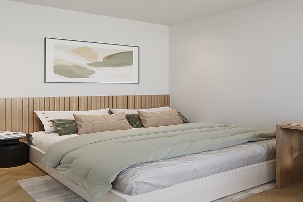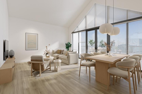 Indeling Via de centrale entree op de begane grond brengt de lift je naar het dakniveau, waar je uitkomt op het gezamelijke dakterras en de voordeur van de woning. Binnen leidt de hal naar twee slaapkamers, de badkamer, een separaat toilet, een inpandige berging en de lichte woonkamer met open keuken. Vanuit de woonkamer heb je direct toegang tot het dakterras. De afwerking is hoogwaardig. De appartementen zijn voorzien van een PVC-visgraatvloer met vloerverwarming in alle ruimtes. De keuken is compleet uitgerust met inbouwapparatuur: kookplaat, combioven, vaatwasser, afzuigkap en koel-vriescombinatie.De badkamer is stijlvol uitgevoerd met een ligbad, inloopdouche, dubbele wastafel en handdoekradiator. Extra opbergruimte is aanwezig in de berging én op de vliering, waar ook de installaties zijn geplaatst.