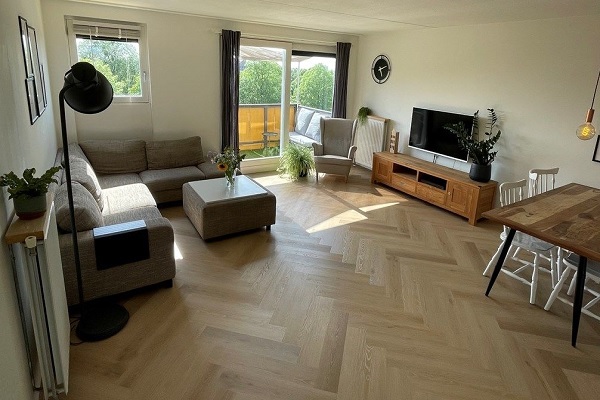 WONINGDELERS TOEGESTAAN! Indeling: Aan de achterzijde bevindt zich de ruime woon-eetkamer (ca. 5.56x5,13 = 28.56m2) met balkon op zuid / west en open keuken (ca. 1.60x3.84 = 7.30m2) met werkblad van 320cm, gas 4 pits kookplaat, vaatwasser, combikoelkast / vriezer, combimagnetron/oven. De ouderslaapkamer (ca. 3.75x3.27 = 12.28m2) bevindt zich aan de voorzijde van de woning met tweepersoonsbed en garderobekast. Vanuit hier is er toegang tot de ruimte waar de wasmachine en droger staat. De tweede slaapkamer (ca. 4.74x2.63 = 12.48m2) grenst aan woonkamer. De badkamer (ca. 2.44x1.81 = 4.44m2) is voorzien van ligbad / douche en een enkele wastafel.