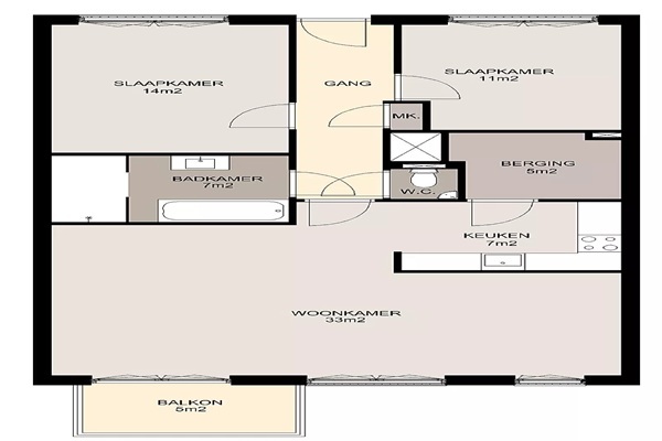 Het appartement beschikt over een royale en lichte woonkamer van ca. 33 m² met directe toegang tot het balkon. De halfopen keuken is voorzien van diverse inbouwapparatuur en biedt voldoende werk- en bergruimte. De woning telt twee slaapkamers van respectievelijk ca. 14 m² en 11 m². De tweede slaapkamer is tevens uitstekend geschikt als werk- of studeerkamer. De luxe badkamer is compleet uitgevoerd met een ligbad, separate douche en wastafel. Daarnaast is er een aparte interne berging met aansluitingen voor wasmachine en droger. Op de begane grond bevindt zich nog een extra (externe) berging en een vaste parkeerplaats in de afgesloten parkeergarage.