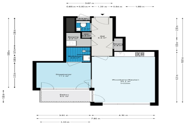 Het appartement heeft een oppervlakte van circa 53m2. Vanuit de hal zijn alle vertrekken van de woning te bereiken. De woonkamer met open keuken heeft een oppervlakte van circa 25 m2 en is voorzien van alle benodigde inbouwapparatuur zoals een kookplaat, combi oven/magnetron, afzuigkap, koelkast, vriezer en een vaatwasser. Vanuit de woonkamer is toegang naar het balkon van circa 5 m2. De slaapkamer heeft een oppervlakte van circa 11 m2. De badkamer is uitgerust met een inloopdouche, wastafel en handdoekradiator. Daarnaast beschikt het appartement over een inpandige berging met wasmachine aansluiting en een separaat toilet. Het appartement wordt opgeleverd met PVC vloer en witte wandafwerking. –Huren met een financiële garantsteller niet toegestaan –Niet mogelijk voor studenten om te huren –Woningdelers niet toegestaan