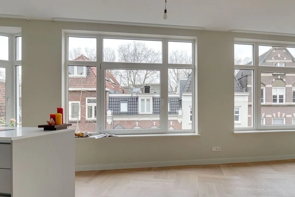 Indeling: de woning met beschermd stadsgezicht heeft 3-kamers waarvan 2 ruime slaapkamers. Begane grond: via de gezamenlijke entree kom je in een ruim en verzorgd trappenhuis. Bij binnenkomst kom je in een ruime hal met een stijlvolle houten visgraatvloer en een praktische vaste kast. Vanuit de hal heb je toegang tot het separate toilet en de moderne open keuken. De keuken is een echte eyecatcher en beschikt over een kookeiland en diverse inbouwapparatuur, waaronder een koelkast, combimagnetron, inductiekookplaat met afzuiging en een vaatwasser. De zeer lichte en royale woonkamer is voorzien van airconditioning en een fraaie houten visgraatvloer, wat zorgt voor een luxe en comfortabele uitstraling. Via de hal bereik je twee ruime slaapkamers en de badkamer. De badkamer is modern uitgevoerd en voorzien van een inloopdouche, wastafel en een aansluiting voor de wasmachine.