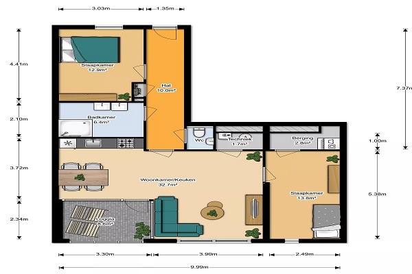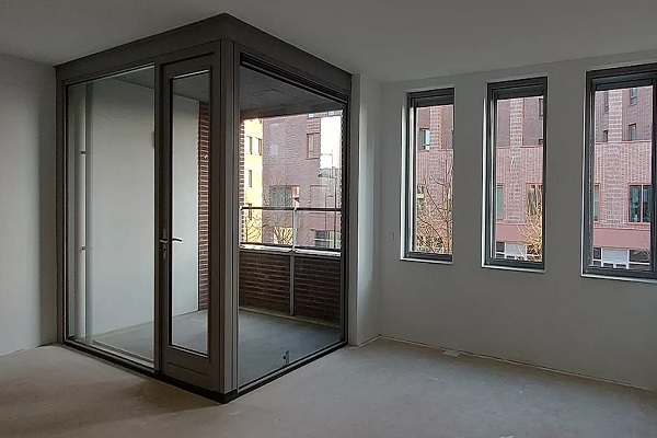Bij binnenkomst betreedt u een royale entree. Direct rechts vindt u de kleinere slaapkamer, gevolgd door de badkamer. Aan de linkerzijde bevindt zich het separate toilet. De badkamer is voorzien van een douche en een dubbele wastafel. De entree leidt naar een ruime en lichte woonkamer met open keuken. De keuken is luxe afgewerkt in een rechte opstelling en beschikt over diverse inbouwapparatuur, waaronder een inductiekookplaat, koel- en vriescombinatie, vaatwasser en combi-magnetron/oven. Door de grote raampartijen geniet u de hele dag van veel daglicht. Het appartement heeft twee slaapkamers. De grote slaapkamer is toegankelijk vanuit de woonkamer en biedt toegang tot een interne berging. Hier kunt u eenvoudig een wasmachine en droger plaatsen. Het appartement beschikt over een loggia op het zuiden, een prettige plek om buiten te zitten en te genieten van de zon.