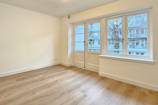 NIET GESCHIKT VOOR DELEN/BORGSTELLERS/STUDENTEN Indeling: Eigen entree op de 1e verdieping. Aan de voorzijde is de woonkamer (ca.10,33M2) met en-suite eetkamer/ keuken (ca. 17,55m2) en toegang tot het balkon op het zuiden. De twee slaapkamers liggen aan de tuinzijde, een slaapkamer is ca. 16,40M2 en de andere slaapkamer is iets kleiner, ca 10,40M2. Het balkon is toegankelijk vanuit beide slaapkamers. De badkamer heeft een inloopdouche. Het toilet is apart. Het appartement is voorzien van dubbele beglazing en PVC vloeren.