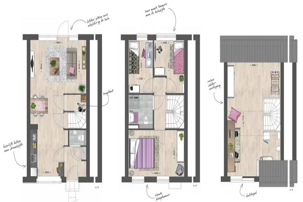 WONINGINDELING -Entree; -Hal met meterkast; -(Deels) betegelde toiletruimte voorzien van zwevend toilet en fonteintje; -Complete keuken aan voorzijde van de woning voorzien van een gaskookplaat, koelkast, combi magnetron/oven, afzuigkap en spoelbak; -Woonkamer aan achterzijde met dubbele tuindeuren welke toegang bieden tot de achtertuin. -3 slaapkamers waarvan 1 royale ouderslaapkamer; -Badkamer voorzien van zwevend toilet, wastafel en douche. -Riante zolder (bereikbaar middels vaste trap) met opstelling wasapparatuur en dakkapel aan voorzijde.