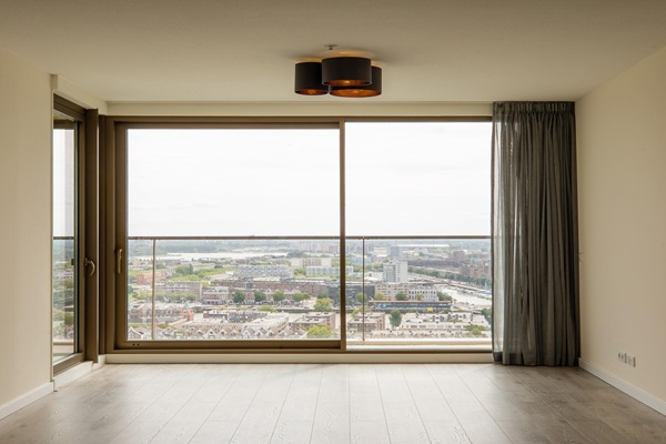 IDEAAL VOOR EXPATS Indeling Begane grond; centrale entree met bellentableau, intercom, brievenbussen en toegang tot de liften, bergingen en parkeergarage. 22e verdieping; zeer nette entree tot de woning, aansluitend de woningentree/gang met aansluitend de ruime hal, met toegang tot de woonkamer met open keuken, toilet en berging. Vanuit de woonkamer is er toegang tot de badkamer en slaapkamers. De gehele woning is voorzien van een hoogwaardige vloer, is volledig geschilderd en gestoffeerd (*en kan indien gewenst volledig gemeubileerd worden opgeleverd*). Het appartement is tevens voorzien van een verwarmings-/koelsysteem met regelbare temperaturen in elke kamer gecombineerd met vloerverwarming (winter) of vloerkoeling (zomer). Aan de voorzijde van het appartement bevindt zich een balkon over de gehele breedte vanwaar u een geweldig uitzicht heeft over de stad! De luxe keuken is voorzien van een inductiekookplaat, koelkast met vriesvak, vaatwasser en voldoende kastruimte. De hoofdslaapkamer is ruim, evenals de tweede slaapkamer/kantoor/studeerkamer.