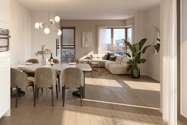 Dan is dit type bij uitstek geschikt door de twee slaapkamers die dit type telt. De subtypes verschillen allemaal op detail van elkaar qua indeling maar hebben de volgende zaken gemeen: zo heeft het appartement een badkamer met modern Villeroy & Boch sanitair én een separaat toilet. Ook is er in de living geruime plaats voor een riante zit- alsook een eethoek die grenst aan de open Novitelli keuken met Whirlpool inbouwapparatuur. Plek genoeg om heerlijk te eten met vrienden of familie. Naast de twee fijne slaapkamers heeft dit type een aparte berging voor jouw was- en droogmachine – wel zo handig. Laten we natuurlijk het heerlijke balkon niet vergeten. Zie jij jezelf hier al zitten? Wij hebben het appartement reeds afgewerkt met vliesbehang en het wit gesausd. Daarnaast is het appartementen voorzien van een zwevende dekvloer en houten plinten. Een fijne basis zodat jij jouw eigen stijl aan het appartement kan toevoegen.
