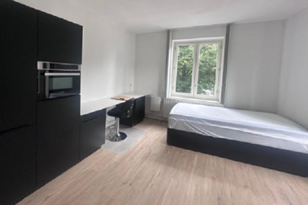 Deze recent gerenoveerde kamer is voorzien van een moderne kitchenette, uitgerust met een inbouwkoelkast met vriesvak en een combi-oven. De kamer is verder ingericht met een comfortabele boxspringbed, inclusief handige opbergruimte. Het pand biedt diverse gedeelde faciliteiten, waaronder: Twee gemeenschappelijke keukens (waarvan één voor het koken en de andere als wasruimte met wasmachine en droger) Drie toiletten en twee badkamers voor gezamenlijk gebruik Schoonmaak van de gemeenschappelijke ruimtes om de twee weken