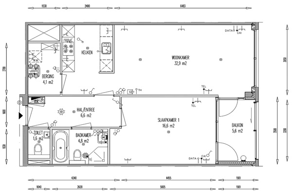 Je komt binnen in de hal, die toegang geeft tot alle vertrekken van het appartement. Vanuit hier bereik je de slaapkamer, badkamer, separate toiletruimte, berging en de woonkamer. De woonkamer is licht en sfeervol dankzij de grote raampartijen tot aan de vloer. De praktische indeling maakt de ruimte prettig in gebruik en de open verbinding met de keuken zorgt voor een moderne uitstraling. Vanuit de woonkamer stap je zo het balkon op, een fijne plek om even buiten te zitten. De keuken is uitgevoerd in een baropstelling en voorzien van alle benodigde inbouwapparatuur. Je beschikt over een keramische kookplaat met afzuigkap, vaatwasser, koel-/vriescombinatie en een combimagnetron. Er is voldoende kastruimte aanwezig en direct achter de keuken bevindt zich een praktische berging met aansluitingen voor de wasapparatuur. De slaapkamer is royaal opgezet en biedt volop ruimte voor een tweepersoonsbed en een grote garderobekast, waardoor je hier comfortabel tot rust komt. De badkamer heeft een praktische indeling en is voorzien van een inloopdouche met glazen wand, ligbad, tweede toilet en een wastafel. Daarnaast is er een separate toiletruimte aanwezig. Het appartement maakt deel uit van een modern complex met lift. Je beschikt over een eigen parkeerplaats in de parkeergarage en een privéberging in de kelder.
