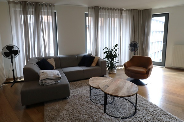 De ingang ligt beschut aan de Bellefroidlunet. De gemeenschappelijke hal met trappenhuis en lift brengt u naar de 5de verdieping. De ruime hal (9,6m²) geeft toegang tot de zonnige woonkamer (32m²) met de vele raampartijen. De half open keuken (17m²) ligt in een hoekopstelling en is v.v. alle moderne apparatuur zoals een vaatwasser, een combi oven, een dubbele spoelbak, een inductie kookplaat, een afzuigkap en ijskast met diepvriesvak. Terug in de hal vindt u de 2 slaapkamers (resp. 28m² en 11,5m²). Beide slaapkamers liggen aan de mooi aangelegde binnentuin. De betegelde badkamer (6m²) is v.v. een douche met glazenwanden, een ligbad en een wastafel. Verder vindt u de inpandige berging (2,5m²) alwaar de aansluting voor wasmachine en droger, het WTW systeem. Het gastentoilet ligt naast de badkamer.