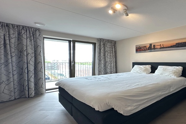 Indeling Entree via een representatieve centrale hal met lift, brievenbussen en bellentableau. De entree van het appartement is op de vijfde verdieping. Je komt het appartement binnen in de hal met separaat toilet, garderobe en toegang tot alle vertrekken. De woonkamer is stijlvol ingericht met een comfortabele hoekbank, design fauteuil, modern TV-meubel en een warme PVC vloer in visgraatmotief. De open keuken is uitgerust met inbouwapparatuur, waaronder een koelkast, vriezer, combi-oven, vaatwasser, inductiekookplaat, en een stijlvolle eethoek met ronde tafel en vier stoelen. Via de schuifpui in de woonkamer bereikt u het overdekte balkon met uitzicht over het water – een plek waar je in alle rust kunt genieten van de zonsondergang. De hoofdslaapkamer beschikt over een luxe boxspring (tweepersoonsbed), twee nachtkastjes en een ruime kledingkast. De tweede slaapkamer is momenteel ingericht als werkkamer met een strak bureau, ergonomische bureaustoel, garderobekast en veel daglicht – ideaal voor thuiswerken. De badkamer is modern en voorzien van een ruime inloopdouche, dubbele wastafel met spiegelkast en strak tegelwerk.