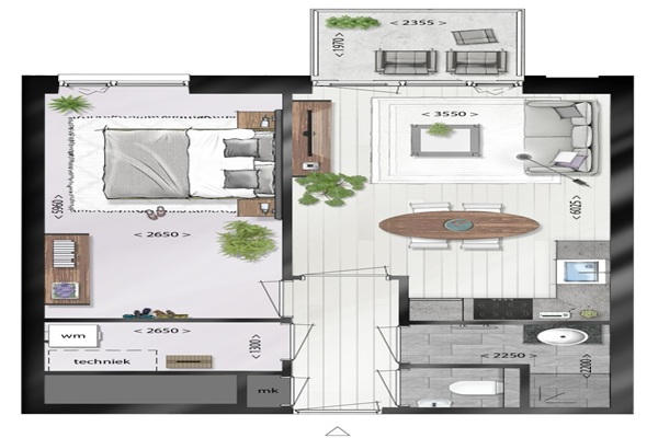 Indeling Deze woning bevind zich op de 5e etage. Je komt binnen in de hal met toegang tot de technische ruimte wat tevens ook als inpandige berging dient.. De woonkamer is voorzien van een moderne keuken die beschikt over inbouwapparatuur, waaronder een inductie kookplaat, combi oven/magnetron, afzuigkap, vries/koelcombinatie en vaatwasmachine. Dit appartement beschikt over een aparte slaapkamer. De badkamer is uitgerust met een wastafel met spiegel en een handdoekradiator. Verder zit er een apart, zwevend toilet nabij de hal. Daarnaast heb je ook nog een een eigen privé buitenruimte!