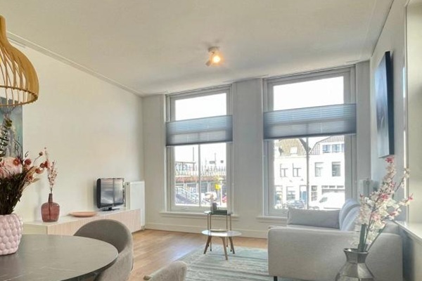 Indeling Via de trap kom je op de eerste etage van het appartementen complex, het appartement is hier gesitueerd. Door de open lay-out en vele ramen heeft de woonkamer met open keuken veel daglicht. De slim ingedeelde keuken is voorzien van inbouw apparatuur zoals een combi oven-magnetron, vaatwasser, koelkast en vriezer. De lichte slaapkamer heeft een tweepersoonsbed en ruime kasten, daarnaast is er voldoende plek om een thuiswerk plek te creëren Aansluitend aan de hal van het appartement is de badkamer welke is voorzien van een douche, bad en wastafelmeubel, het toilet is seperaat. In de inbouwkast in de hal zijn meerdere schoenen kasten geplaats, hier is tevens de wasmachine. Niet geschikt voor woningdelers