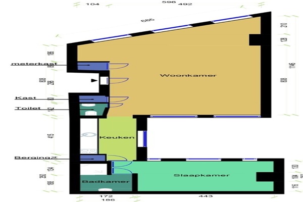 Indeling: Steile trap naar de eerste etage. Zeer ruime en lichte woonkamer van circa 60m2 met een gashaard. De gashaard blaast warme lucht de ruimte in bij gebruik. Keuken in separate ruimte. De keukenunit heeft een hardstenen blad en beschikt over een 5 pits gasfornuis met wok brander, oven, koelkast, vriezer en afwasmachine. Alle apparatuur is van Siemens. 1.5 spoelbak met Quooker. Ruime slaapkamer van ongeveer 16 m2. Badkamer met inloopdouche, wastafelmeubel en handdoeken radiator. Toilet, Berging en kast met wasmachine. In alle vertrekken ligt een klassieke licht eikenhouten parketvloer met visgraatmotief. De vetrekken hebben een authentieke balkenplafond en paneel deuren.
