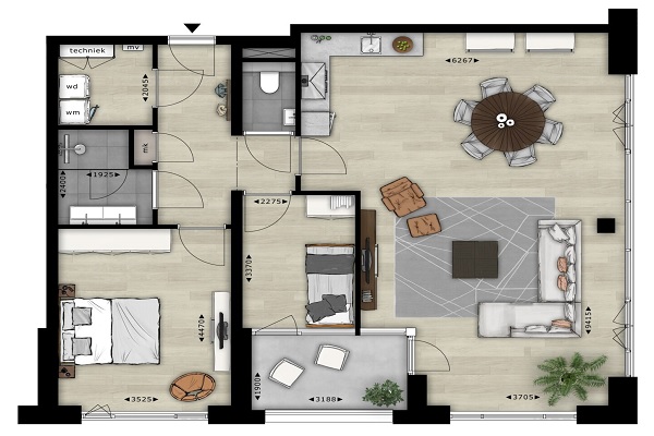 Strijp-S is een van de meest gewilde en dynamische wijken van Eindhoven. De wijk staat bekend om haar industriële charme, creatieve sfeer en levendige karakter. Op loopafstand vind je tal van hippe restaurants en gezellige, zoals Het Ketelhuis, De Huiskamer, Het huisje en MOOD (bekend om de beste sushi van de stad). Ook op winkelgebied kom je hier niets tekort: unieke speciaalzaken en boetieks liggen om de hoek. Voor een uitgebreider aanbod ben je via de nabijgelegen PSV-laan binnen enkele minuten in het centrum van Eindhoven. De bereikbaarheid is uitstekend. Station Eindhoven Strijp-S ligt op loopafstand en met de auto ben je snel op. Voor ontspanning wandel je zo naar het Philips de Jonghpark of geniet je van de vele evenementen die Strijp-S rijk is. –3-kamerappartement –Gelegen op de hoek van het gebouw –Veel lichtinval door grote raampartijen –Ruime living met open keuken –Twee slaapkamers –Moderne badkamer –Separaat toilet –Fijne loggia Alle appartementen in Sixty5 zijn tot in de puntjes afgewerkt. Het enige dat je hoeft te doen, is je meubels te verhuizen – ideaal! Waar de badkamer is voorzien van smaakvol sanitair van Villeroy & Boch, is de moderne keuken uitgerust met alle inbouwapparatuur om het koken nóg leuker te maken. Op de vloer ligt een luxe PVC vloer met houtlook en de wanden zijn reeds afgewerkt én geschilderd. Laten we ook de aanwezige internetaansluiting in zowel de woon- als slaapkamer niet vergeten. Je kunt dus direct van start met het leukste het decoreren van deze absolute droomwoning! De keukens van de appartementen zijn met alle denkbare apparatuur opgeleverd – koken was nog nooit zo ontspannen! Probeer de lekkerste recepten uit op een fijn 4-pits kooktoestel, houd alle ingrediënten koel en vers in de ruime koelkast en warm iets gemakkelijk op in de ruime combi magnetron. Heerlijk gegeten? Dan is de vuile vaat zo weg dankzij een praktische vaatwasser voorzien van de laatste technieken. Bon apétit! Ook de vloeren in jouw nieuwe huurappartement hebben we reeds voorzien van een prachtige én praktische PVC-vloer met een moderne houtlook. Het PVC is bijzonder handig in het onderhoud, maar geeft tegelijkertijd de luxe uitstraling van een houten vloer. Sterker nog: hij is niet van een echt exemplaar te onderscheiden. Wat een luxe! Ook de badkamer is luxe afgewerkt met smaakvol sanitair van Villeroy & Boch. ’s Morgens wakker worden en je tanden poetsen aan de wastafel met onderkast, handig voor het opbergen van toiletspullen. Tijdens een slaperig moment oppassen dat je je voet stoot bij het betreden van de douche? Niet nodig dankzij de inloopdouche met vlakke vloer én moderne drain. Alles oogt daarbij stijlvol en modern – helemaal van deze tijd!