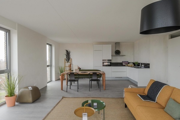 Het 3-kamerappartement van 80 m² ligt op de eerste verdieping en biedt een lichte, ruime woonkamer met moderne keuken voorzien van inductiekookplaat, bakoven, koel-/vriescombinatie en geïntegreerde vaatwasser. De badkamer is compleet met inloopdouche, ligbad, wastafelmeubel en designradiator. Daarnaast zijn er een separaat toilet, handige berging/bijkeuken en een extra kamer die ideaal is als werk-, hobby- of logeerkamer. Het balkon op het zuidwesten biedt prachtig zicht.