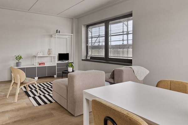 Het appartement is 48 m² groot en heeft een slimme indeling. Als je het appartement betreedt stap je de hal binnen. Hier is de deur naar je eigen luxe badkamer met toilet, wasmeubel en douche. Aan het einde van de hal bevindt zich de open keuken, voorzien van een koelkast en een kleine kookplaat. De woonkamer heeft grote ramen die voor lekker veel licht zorgen. En het uitzicht is overal prachtig. Naast de woonkamer vind je de ruime slaapkamer, groot genoeg voor een bed en een flinke kledingkast. Door het hele appartement ligt al een pvc vloer en alle ramen zijn voorzien van raambekleding. Kwestie van verhuizen!