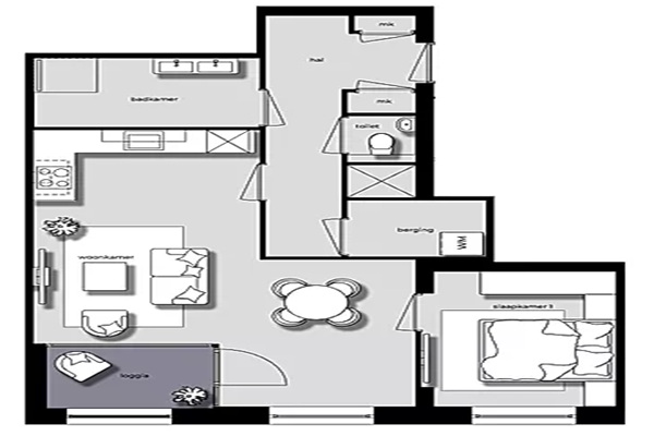 Je komt binnen in de hal die toegang geeft tot alle vertrekken. De woonkamer is ruim opgezet en staat in open verbinding met de moderne keuken, die is voorzien van diverse inbouwapparatuur. De slaapkamer is comfortabel en biedt voldoende ruimte voor een tweepersoonsbed en kastruimte. De badkamer is netjes afgewerkt en beschikt over modern sanitair. Daarnaast is er een separaat toilet en praktische bergruimte aanwezig.