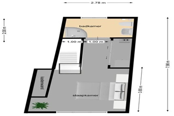 Door de indeling vooral geschikt voor jonge stellen en/of alleenstaanden. Entree, waarin de meterkast en toegang tot de woonkamer. Aan de voorzijde ruimte voor een zitje, werkplek of naar eigen believen in te richten. De zithoek bevindt zich aan de achterzijde met openslaande deuren naar de patio. De trap in stijl brengt u naar de eerste verdieping. De woonkeuken bevindt zich aan de voorzijde van deze verdieping en is voorzien van een nieuwe inrichting. Van hier is er zicht op de Markt. Een gastentoilet onder de trap naar de tweede verdieping. Aan de achterzijde een ruimte met openslaande deuren en frans balkon, weer een extra ruimte om bijvoorbeeld een thuiswerkplek te realiseren. Overloop met een kastenwand waarin opstelplaats wasapparatuur en combiketel. Verder op deze verdieping de badkamer met douche toilet en wastafel en de ruime slaapkamer met kasten. De woning wordt niet verhuurd aan woningdelers die geen duurzame gemeenschappelijke huishouding voeren.