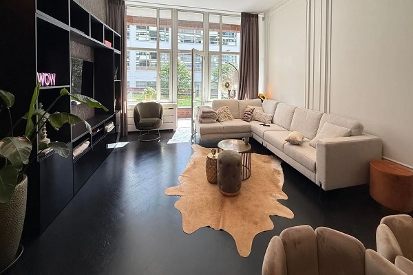 De entree van het appartement straalt een warme en chique sfeer uit. De ruime hal biedt toegang tot het toilet, de woonkamer, de twee slaapkamers en de badkamer. De grote raampartijen in de woonkamer zorgen voor natuurlijk licht, wat bijdraagt aan de ruimtelijke en open sfeer in de entree. De glazen tussendeur versterkt dit effect ook, waardoor het licht vrij door de verschillende ruimtes kan stromen. De naadloze gietvloer, die doorloopt van de hal naar de keuken, de bijkeuken en naar één van de twee slaapkamers, zorgt voor een strakke en moderne uitstraling en is erg onderhoudsvriendelijk. Het appartement is voorzien van stadsverwarming, met de meterkast ook in de entree van het appartement.