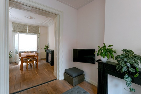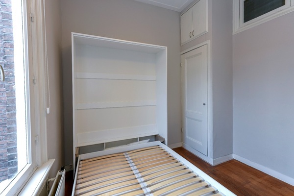 Indeling: Entree woning hal met meterkast, L-vormige gang, kamer en suite ca. 8.92 x 3.68 met originele schuifseparatie met houten vloer en hoge plafonds met sierpleister en toegang tot de patio ca. 3.21 x 2.21, gezellige ingerichte keuken ca. 2.21 x 2.47 met koel-vries combinatie, afzuigkap, vaatwasser, 5 pits gasfornuis met oven. Badkamer met douche, wastafelmeubel en toilet. slaapkamer ca. 302 x 3.47, met toegang tot de overdekte Patio ca. 3.47 x 2.28. Trap naar de opkamer met 2e slaapkamer ca. 2.42 x 3.48 met vaste kast.