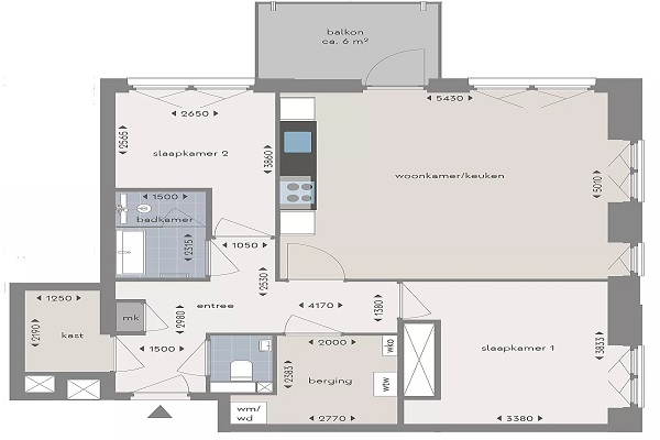 Dit appartement beschikt over een functionele en efficiënte indeling met een ruime woonkamer en open keuken. De woonkamer heeft direct toegang tot het balkon van circa 6 m², wat zorgt voor extra buitenruimte. De keuken is praktisch opgesteld en voorzien van de benodigde aansluitingen. De woning telt twee slaapkamers, beide geschikt voor gebruik als slaap-, werk- of logeerkamer. De badkamer is centraal gelegen en voorzien van douche en wastafel. Daarnaast is er een separate toiletruimte. In de woning bevindt zich een interne berging met aansluitingen voor wasmachine en droger, evenals ruimte voor extra opslag. De entree biedt toegang tot alle vertrekken. Afhankelijk van het woningtype kan de keukenopstelling afwijken en kan de aanwezigheid van een vaste kast verschillen. Afmetingen en indeling zijn indicatief. De ligging biedt goede bereikbaarheid van voorzieningen, openbaar vervoer en uitvalswegen. De woning is geschikt voor diverse doelgroepen die op zoek zijn naar een praktisch ingedeeld huurappartement.