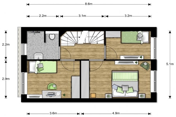 In de hal vind je de toiletruimte, de meterkast en de trapopgang naar de eerste verdieping. Vanuit de ruime woonkamer met trapkast geven de openslaande deuren je toegang tot de achtertuin. De luxe keuken is uitgevoerd met een 5-pits inductiekookplaat, afzuigkap, koelkast, vaatwasser, combimagnetron en een natuurstenen werkblad. Vanaf de overloop bereik je 3 slaapkamers en de badkamer met inloopdouche, wastafel en een tweede toilet. De ruime zolder is bereikbaar via een vaste trap, waardoor deze ruimte volop mogelijkheden biedt als hobbyruimte of als werk- of studeerkamer. Ook vind je hier de witgoedaansluitingen.