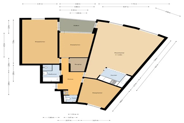 Bij binnenkomst komt u in een ruime entree die toegang biedt tot alle belangrijke ruimtes: de toiletruimte, badkamer, slaapkamers, berging en woonkamer. De toiletruimte is deels betegeld en voorzien van een vrijhangend toilet en een fonteintje. Ruime woonkamer met open keuken met een fraaie natuurlijke lichtinval door de grote raampartijen. De woonkamer is dusdanig ruim dat er plek is voor een grote zithoek en eettafel. Vanuit de woonkamer ook toegang tot het balkon. De keuken in een L-opstelling is van alle gemakken voorzien. Je vindt hier een vaatwasser, gaskookplaat, rvs afzuigkap, combi-oven, een koelkast en een vriezer. Daarnaast zijn er meer dan voldoende opbergmogelijkheden. De badkamer is volledig betegeld en modern afgewerkt. U vindt hier een ruime inloopdouche, ligbad en wastafel.