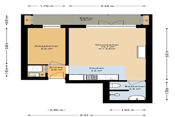 De woning ligt op de eerste verdieping welke per trap bereikbaar is. Je komt binnen in een hal met een ruimte voor de CV en de aansluiting voor een wasmachine. Via deze hal kom je ook in de slaapkamer. De woonkamer met open keuken geven toegang tot het balkon. De keuken is voorzien van een gaskookplaat, koelkast, combi-oven, vaatwasser en een afzuigkap. De badkamer is voorzien van wastafel, douche en toilet.