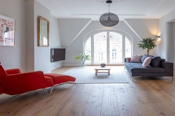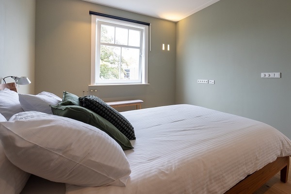 De belangrijkste leefruimtes bevinden zich op de tweede verdieping. De ruime woonkamer beschikt over hoge plafonds met decoratieve details, veel natuurlijk licht en een verfijnd interieurontwerp. Het zit- en eetgedeelte lopen naadloos in elkaar over en vormen samen een elegante en comfortabele ruimte, ideaal voor zowel dagelijks gebruik als het ontvangen van gasten. De moderne designkeuken, eveneens gelegen op deze verdieping, is strak vormgegeven en volledig uitgerust met hoogwaardige inbouwapparatuur, waaronder een BORA-inductiekookplaat met geïntegreerde afzuiging, een Quooker-kraan voor kokend water, een combi-oven, vaatwasser, koelkast en vriezer. Alle benodigde keukeninventaris is aanwezig. Vanuit de keuken is er directe toegang tot een van de balkons, ingericht met tuinmeubilair en perfect om te ontspannen. Op de tweede verdieping bevindt zich tevens de tweede slaapkamer, gelegen aan de voorzijde van het appartement. Deze multifunctionele ruimte is voorzien van een opklapbed (Murphy bed) en is daardoor ideaal te gebruiken als logeerkamer, thuiskantoor of extra slaapkamer. De derde verdieping herbergt de privévertrekken van het appartement. Hier bevinden zich de hoofdslaapkamer en de luxe badkamer. De hoofdslaapkamer is gelegen aan de achterzijde, smaakvol ingericht en voorzien van ingebouwde kasten. De moderne badkamer is hoogwaardig afgewerkt en beschikt over een ruime inloopdouche en een eigentijds wastafelmeubel. Een wasmachine en droger zijn netjes weggewerkt in een ingebouwde kast. Daarnaast is er een separaat toilet, eveneens modern afgewerkt. In het gehele appartement zorgt vloerverwarming voor optimaal comfort en een strakke, radiatorvrije uitstraling.
