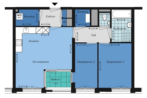 In de hal vindt u de meterkast, berging en de toiletruimte. Vanuit de hal betreedt u de ruime woonkamer met open keuken en deur naar het balkon (zuiden). De keuken is voorzien van luxe Siemens inbouwapparatuur zoals een keramische kookplaat, afzuigkap, vaatwasser, combi oven en koel/vriescombinatie. De badkamer is voorzien van wastafel, douche en ligbad. Het appartement beschikt over 2 slaapkamers waarvan er één toegang heeft tot het balkon. De woning beschikt over een parkeerplaats in de parkeergarage.