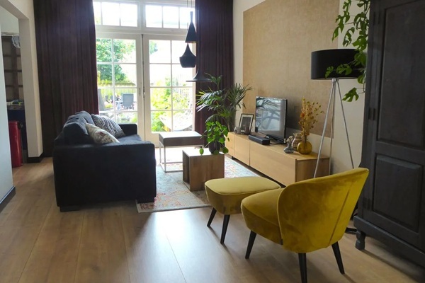 Indeling Entree, hal, voorraadkast, badkamer met douche, toilet en fonteintje. Er is een grote lichte woonkamer voorzien van vloerverwarming met een moderne open keuken. Er is diverse apparatuur aanwezig zoals een kokend waterkraan, gasfornuis met wok brander, afzuigkap, grote oven, vaatwasser, grote koelkast met vriezer en wasmachine. Aangrenzend bevindt zich een ruime slaapkamer, voorzien van een tweepersoonsbed, een grote hoeveelheid kastruimte, wastafel en een heerlijk vrijstaand bad. Er is een ruime zonnige achtertuin aanwezig gelegen op het zuiden, met een loungeset en meerdere andere zitjes zodat zowel de zon als schaduw opgezocht kan worden.