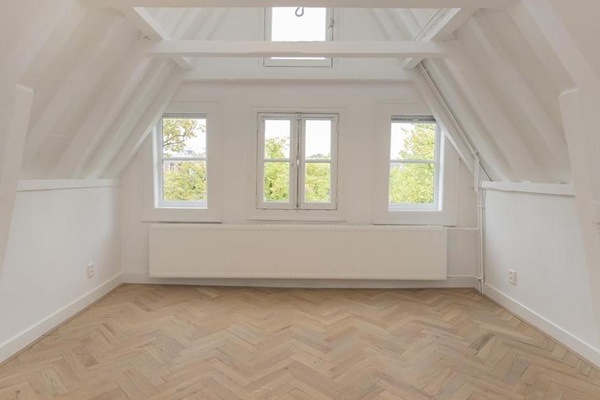 Indeling: Gezamenlijke entree, trap naar de tweede verdieping. U komt het appartement binnen in een open ruimte die toegang biedt tot de woonkamer, keuken en trap naar de bovenste verdieping. De lichte woonkamer heeft een waanzinnig uitzicht, mooie raambekleding en is zeer ruim. De houten visgraatvloer is zojuist geplaatst en past perfect bij dit karakteristieke appartement. De moderne open woonkeuken is gloednieuw, gelegen aan de achterzijde van het appartement en voorzien van veel raampartijen. De unieke blauwe tegels maken de kamer huiselijk en er is voldoende ruimte voor een gezellige eettafel. Naast de keuken bevindt zich het aparte gastentoilet. Trap naar de bovenste verdieping, een zeer open ruimte, originele balken, een moderne badkamer en het dakterras. Aan de voorzijde bevindt zich de slaapkamer, wederom met een schitterend uitzicht. Deze kamer is extreem hoog met prachtige balken en de authentieke ladder leidt naar een ruime berging. De fraaie badkamer met prachtige tegels is in het midden van de vloer gelegen en beschikt over een dakraam, inloopdouche, wastafel met lades en een toilet. Een extra ruimte waar de aansluiting voor de wasmachine zich bevindt en die gebruikt kan worden als thuiswerkkantoor of inloopkast. Het ruime dakterras heeft een groen uitzicht en is voorzien van een grote tafel met stoelen.