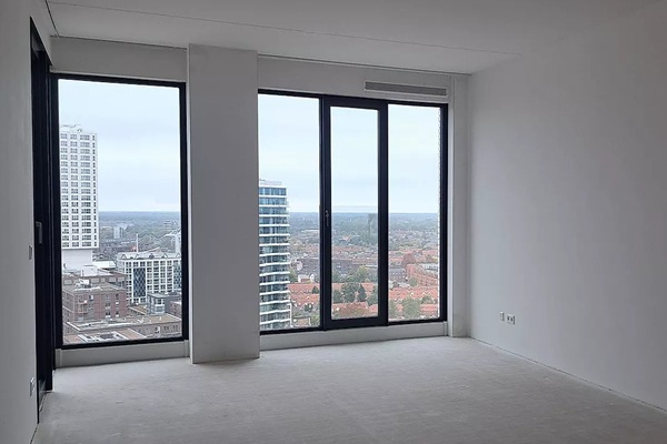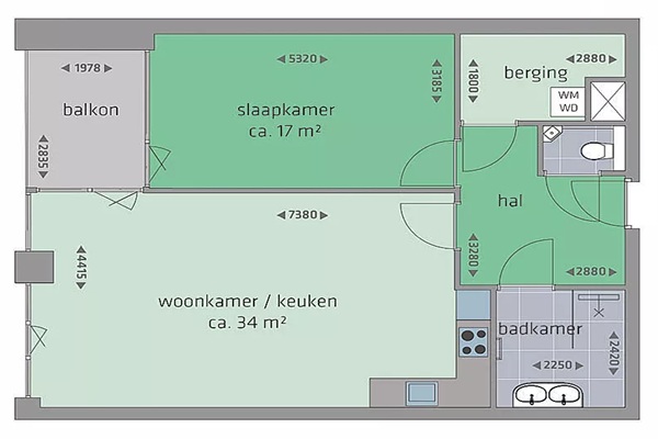De woonkamer en keuken vormen samen een leefruimte van ongeveer 34 m² en bieden voldoende ruimte voor een zit- en eetgedeelte. Vanuit de woonkamer is er toegang tot het balkon, dat zorgt voor buitenruimte aan de woning. De keuken is praktisch ingericht en direct verbonden met de leefruimte. De slaapkamer heeft een oppervlakte van circa 17 m² en biedt plaats voor een tweepersoonsbed en kastruimte. De badkamer is voorzien van een douche en wastafel en is bereikbaar vanuit de hal. Het toilet is separaat gesitueerd. Daarnaast beschikt de woning over een interne berging met aansluitingen voor een wasmachine en wasdroger. De hal vormt de centrale toegang tot alle vertrekken.