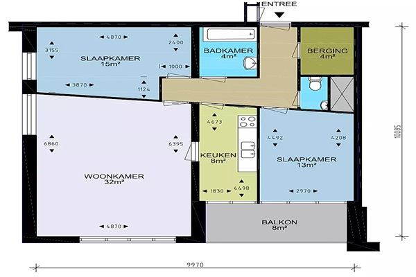 Het appartement beschikt over een royale en lichte woonkamer van maar liefst 32 m², ideaal voor ontspanning. Vanuit de hal bereik je de twee slaapkamers met een oppervlakte van circa 15 m² en 13 m², beide praktisch ingedeeld en multifunctioneel inzetbaar. De dichte keuken is voorzien van een gaskookplaat, elektrische oven, spoelbak en afzuigkap. Vanuit de keuken heb je direct toegang tot het balkon, een fijne plek om even buiten te zitten. De badkamer is uitgerust met een ligbad en/of separate douche, wastafel en designradiator. Het toilet bevindt zich in een aparte ruimte. Daarnaast beschikt het appartement over een inpandige berging met aansluitingen voor een wasmachine en/of droger.