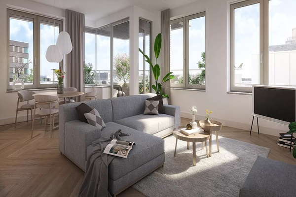 Dit appartement biedt een ruime en praktische indeling met een duidelijke scheiding tussen wonen, slapen en werken. De woonkamer vormt het centrale punt van de woning en sluit direct aan op de open keuken, waardoor een functionele en overzichtelijke leefruimte ontstaat. Vanuit de woonkamer is er toegang tot het balkon, dat voldoende ruimte biedt voor een zitje. De slaapkamer is van goed formaat en biedt plaats aan een tweepersoonsbed en kastruimte. Daarnaast is er een aparte werkkamer, geschikt voor thuiswerken of als extra logeerruimte. De badkamer is modern en efficiënt ingericht en er is een separate toiletruimte. In de hal bevindt zich ruimte voor de wasmachine en technische installaties, wat zorgt voor een nette en praktische indeling van de woning. Door de grote raampartijen is er veel daglicht in de leefruimtes en voelt het appartement licht en open aan. De woning is geschikt voor een stel of een werkende professional die op zoek is naar een comfortabel en goed ingedeeld appartement met buitenruimte.