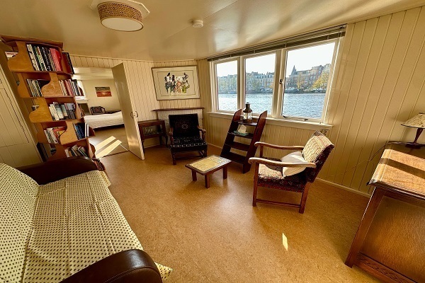 De grote ramen van de woonboot laten veel natuurlijk licht binnen en bieden een adembenemend uitzicht op de omgeving. Open en lichte woonkamer Volledig uitgeruste keuken Twee ruime slaapkamers Badkamer met inloopdouche en wastafel Klein terras (voordek)